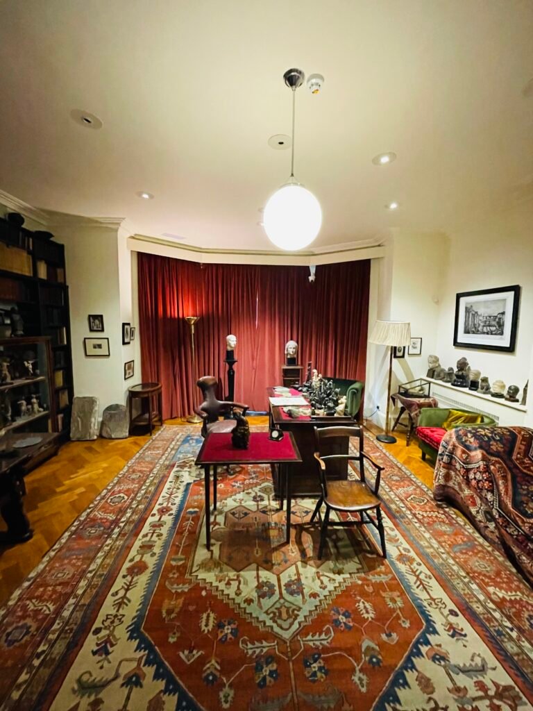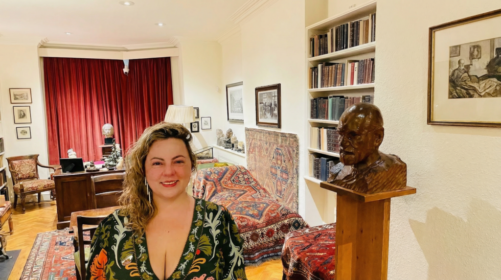 Simplesmente não conseguia sair do Museu, entrar no Consultório do Freud foi uma sensação única, seus pertences, obras de artes, seu lugar de trabalhar, escrever, escutar… Me senti imensamente grata a vida, a ele, a psicanálise, ao meu percurso que me trouxe até aqui: Que alegria ver aonde eu tinha chegado, no exato lugar em que eu queria estar, faria a mesma escolha todas as vezes.